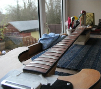 The truss rod is essentially a long metal rod that is inserted into the neck of the